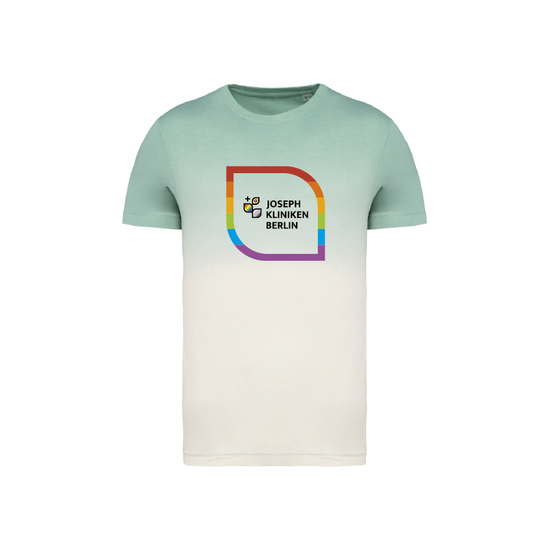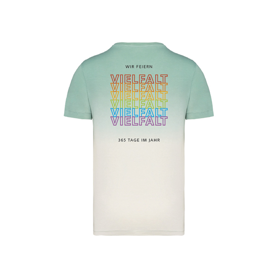 Das T-Shirt ist auf Vorder- und Rückseite unterschiedlich, mit einem großen Diversity Aufdruck versehen.